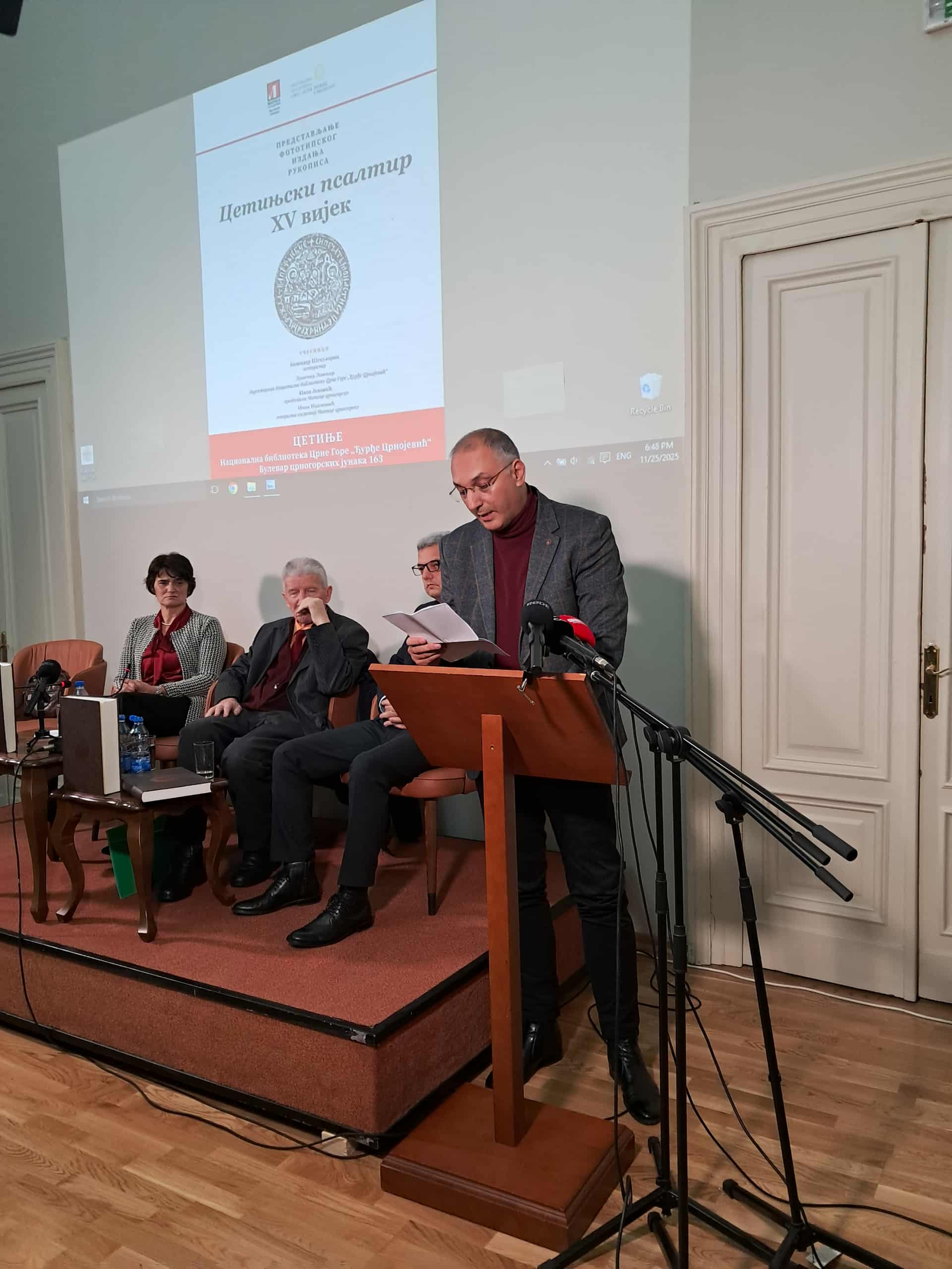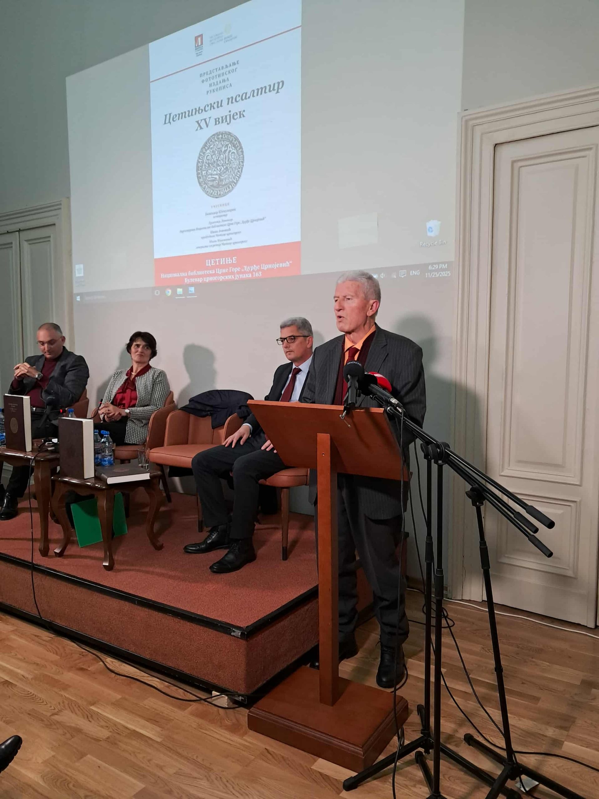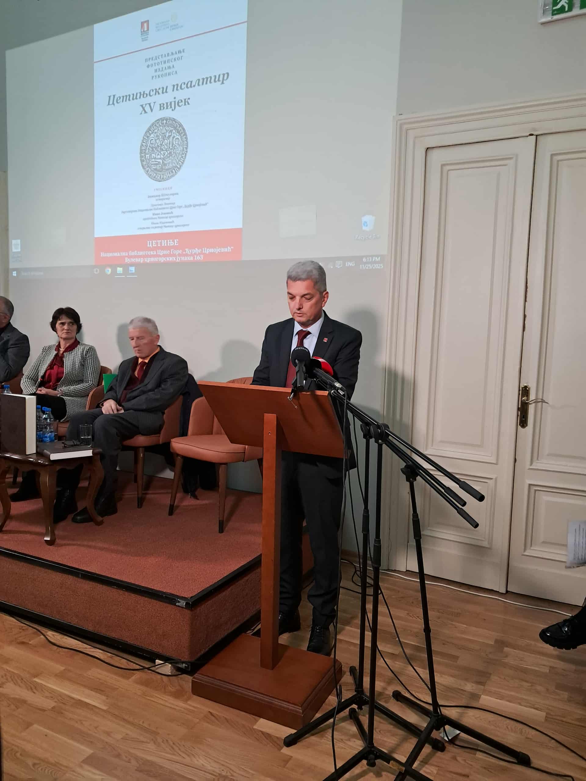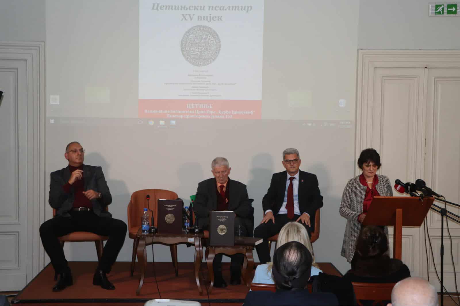 Večeras imam posebno zadovoljstvo što je Matica crnogorska uspjela da još jedan marker identiteta crnogorskog naroda – Cetinjski psaltir iz XV vijeka publikuje u obliku fototipskog izdanja, i na taj način vrati ga u kolektivnu memoriju, pa samim tim čineći ga dostupnim zainteresovanoj, prvenstveno stručnoj javnosti. Primjer Cetinjskog psaltira iz XV vijeka je dokaz da naša srednjevjekovna istorija nije zapisana samo u kamenu, gdje su sačuvana razna imena i titule od naših srednjevjekovnih vladara, preko crkvenih velikodostojnika, pa do običnog puka, već su naši preci veoma rano počeli ostavljati tragove u rukopisima na staroslovenskom jeziku, što predstavlja osobenost jezičkog, odnosno kulturološkog izraza predaka Crnogoraca.